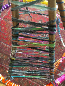 This is optional, but I then made a wire circle with a few loops of garden wire to create a door which I also covered in rags and tied this to the canes. This was to create a pretend door and then I began to decorate by wrapping the structure in decorative ribbon, string, wool and trim that I had lying around.