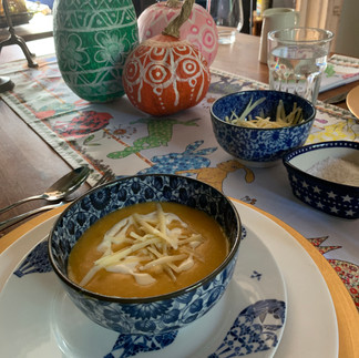 Delicious, delicious! Enjoy your soup on your beautiful Autumnal table, dressed to impress and wonder why you ever carved pumpkins in the first place!
