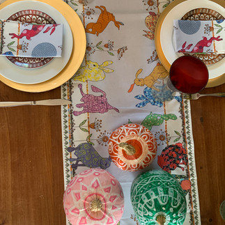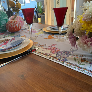 Step Six: Use your pumpkins to decorate your table! We've paired our pumpkin masterpieces with the 'Flick of Hares' table runner and matching napkins by MollyMac to really elaborate on the Autumn vibes and we've also mixed and matched our pumpkins with flowers, greenery, dried blooms and grasses. Matching plates and glasses are also really effective to get that cosy feel.